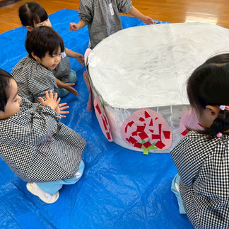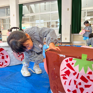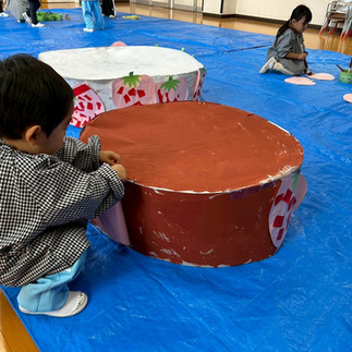 大きなケーキには、みんなが4.5月に作ったいちごの作品を貼って完成!
