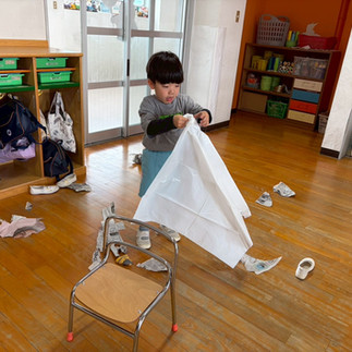 びりびりと破る感触を味わいながら、並べてみたり紙吹雪をしてみたりとまずは素材に触れる姿が♪